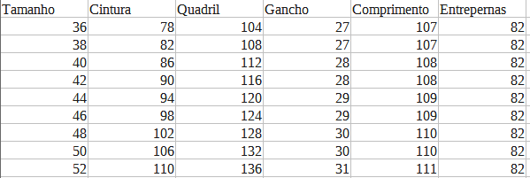 Importante: Antes de efetuar a compra, consulte a tabela de medidas abaixo para ter certeza de receber um produto certo para seu tamanho.