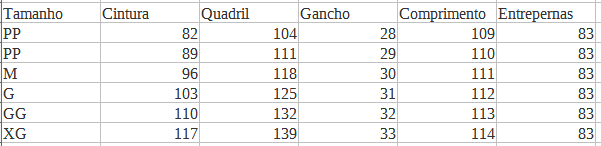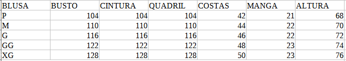 Importante: Confira a tabela de medidas abaixo antes de efetuar a compra, para receber um produto certo para seu tamanho.